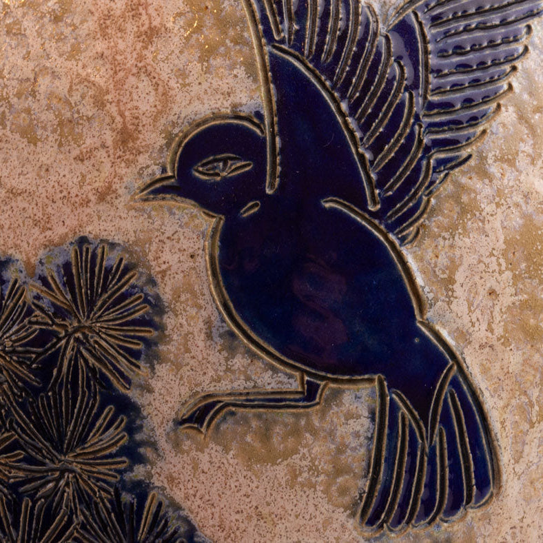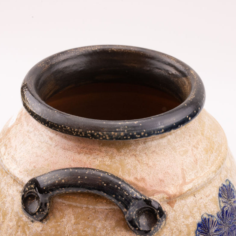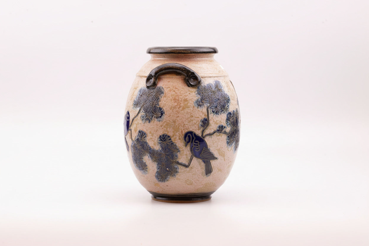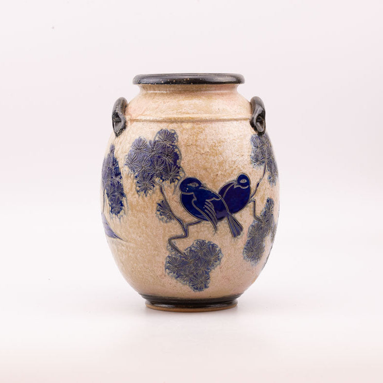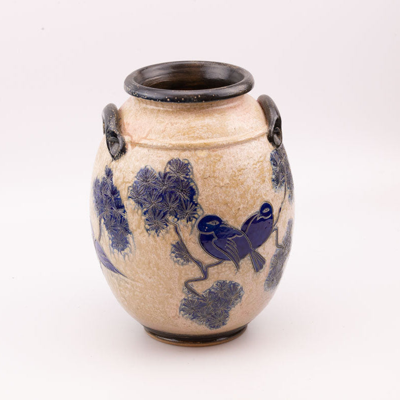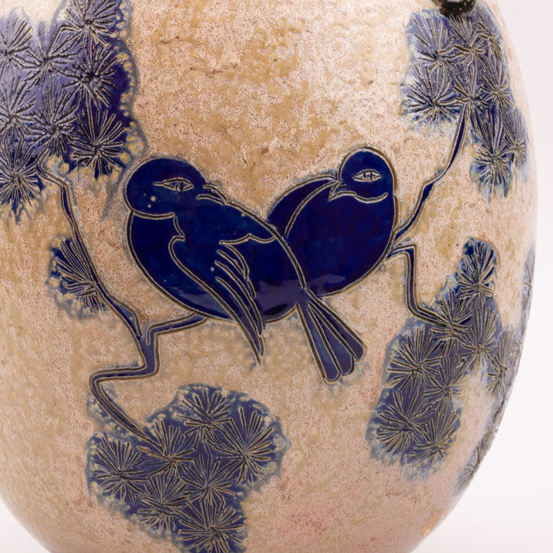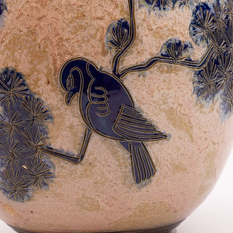 Large salt-glazed stoneware vase made in Bouffioulx by the Guérin family, specifically by Jules, the son. The stylized blue bird... Read more