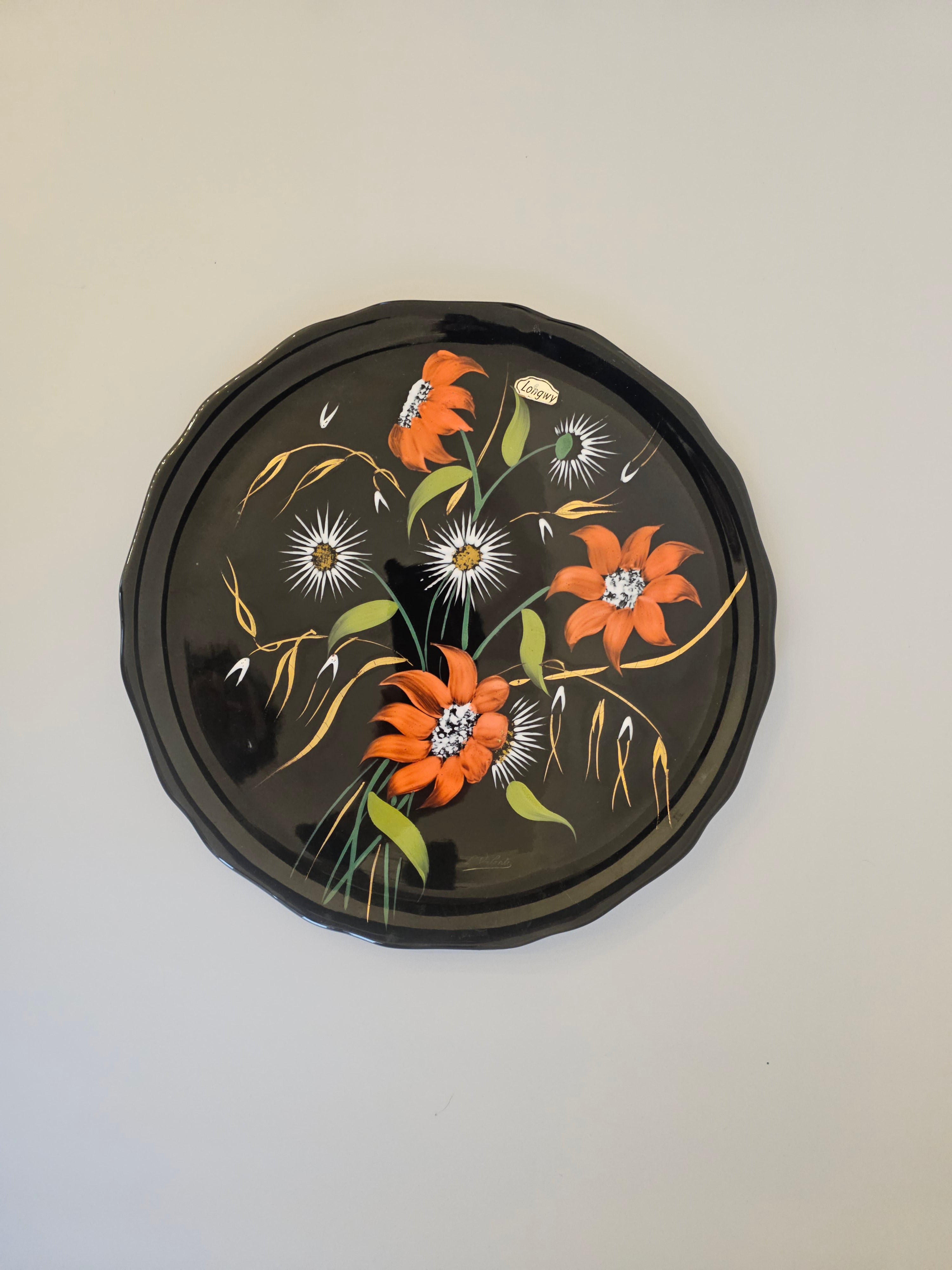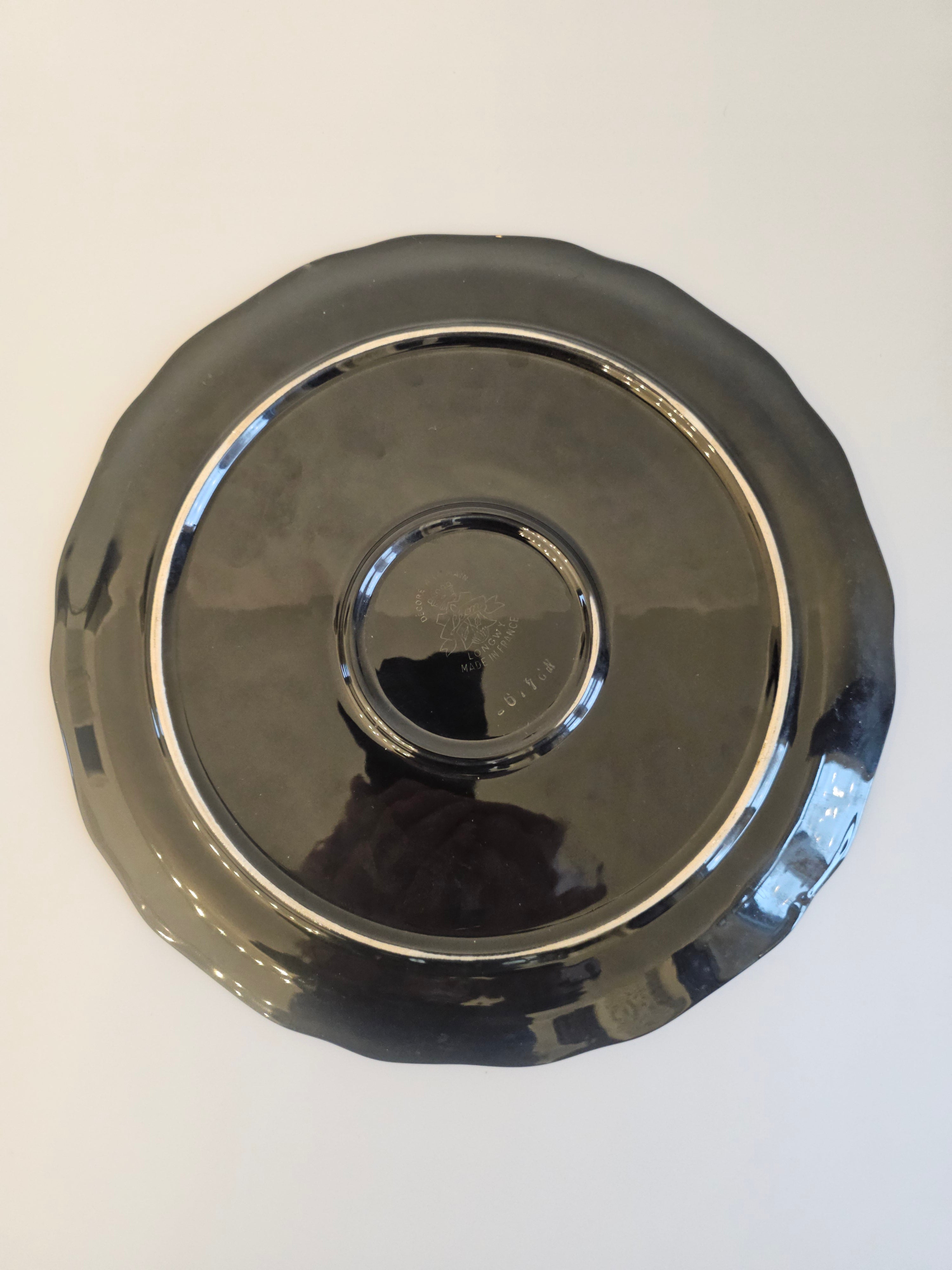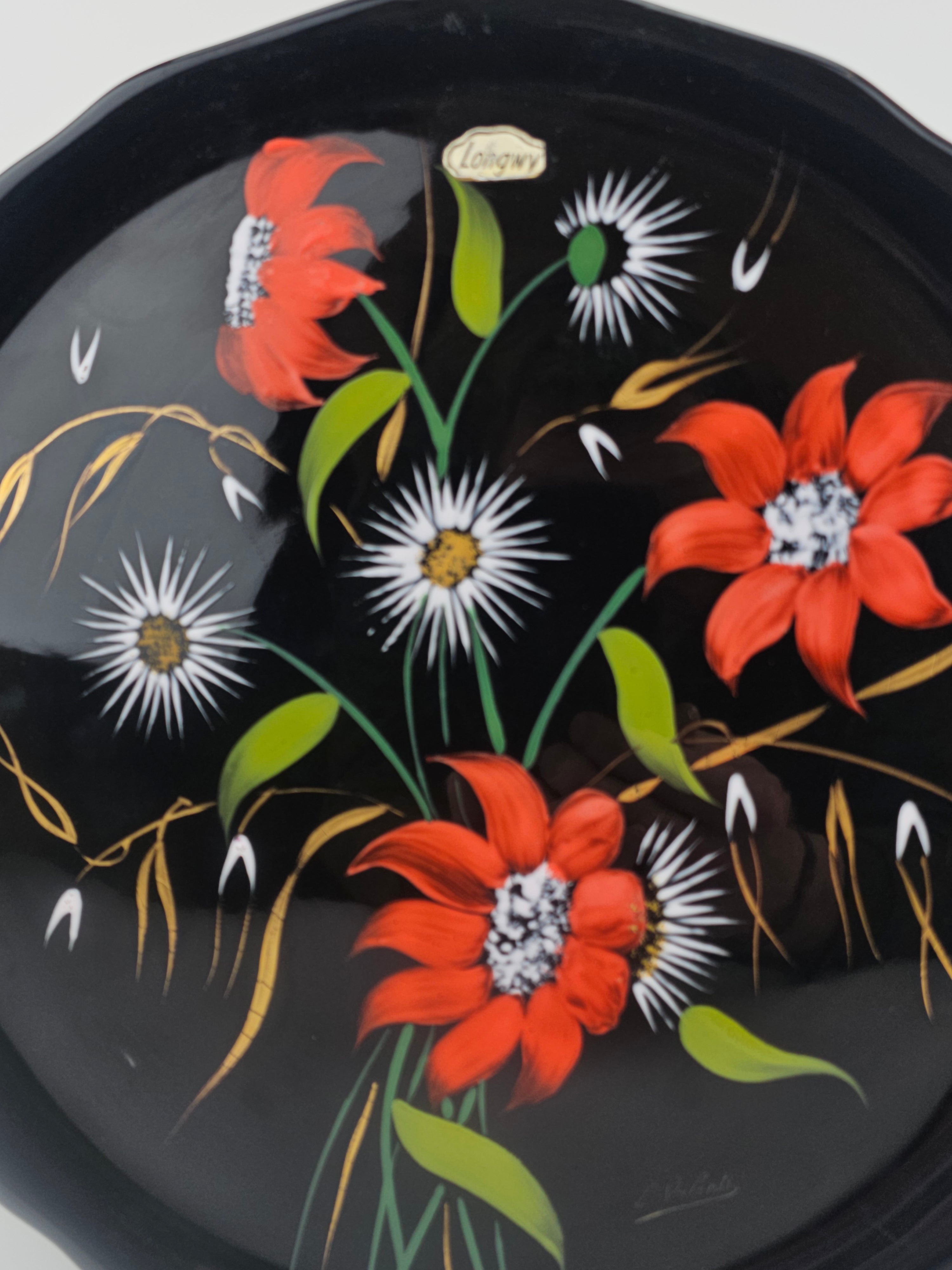 Plat en porcelaine désigné Valenti pour Longwy noir et à motifs fleuris