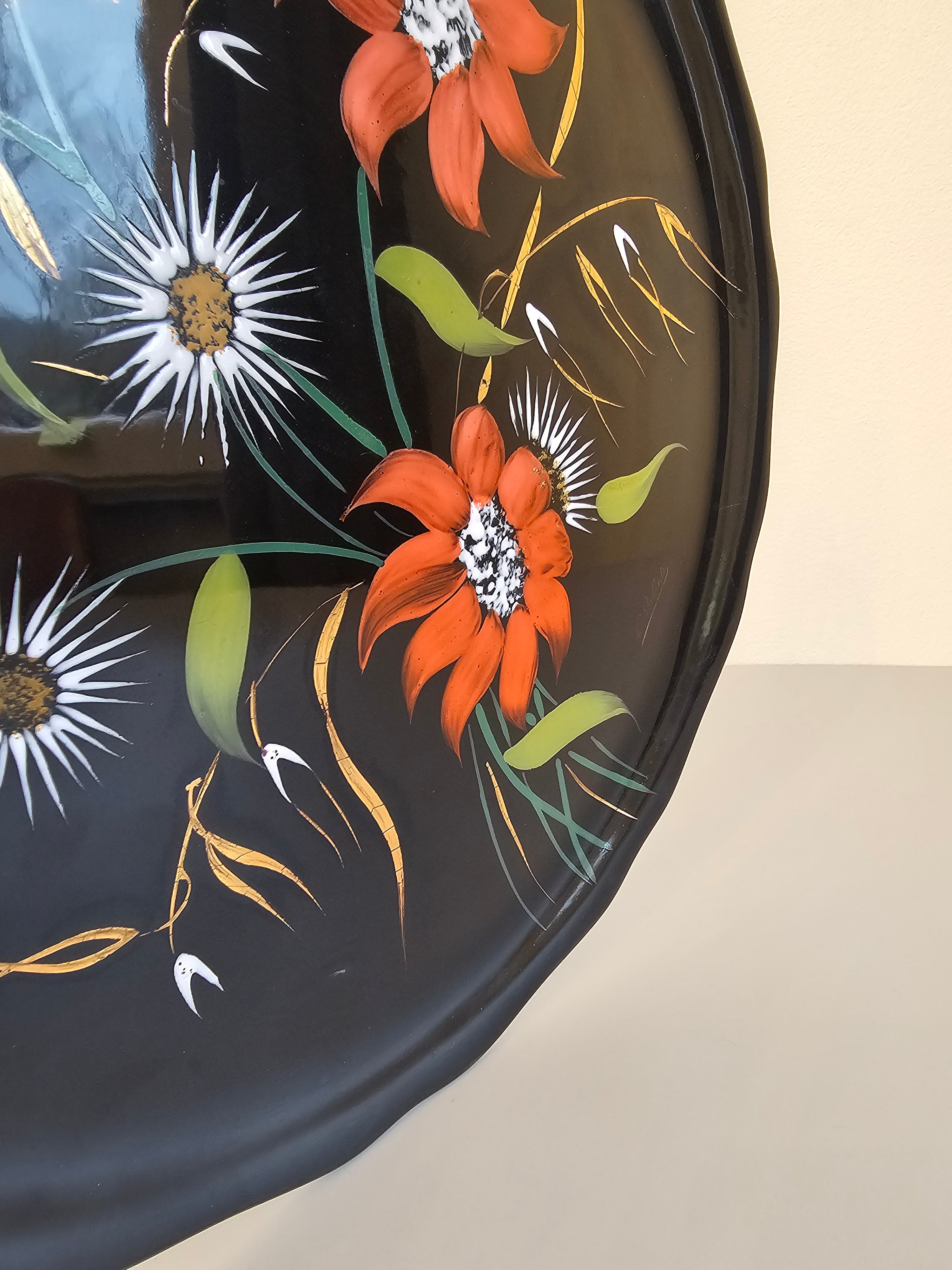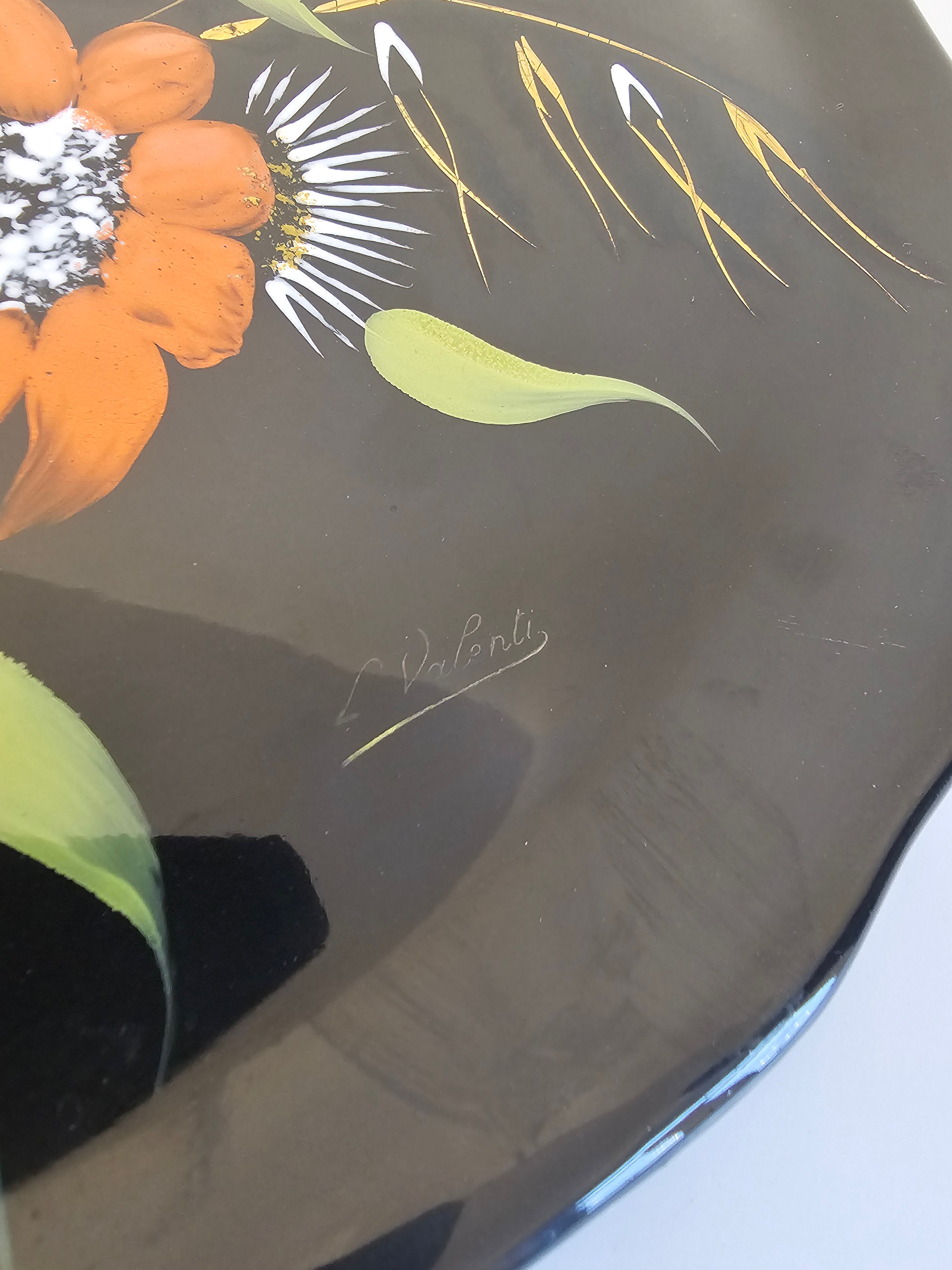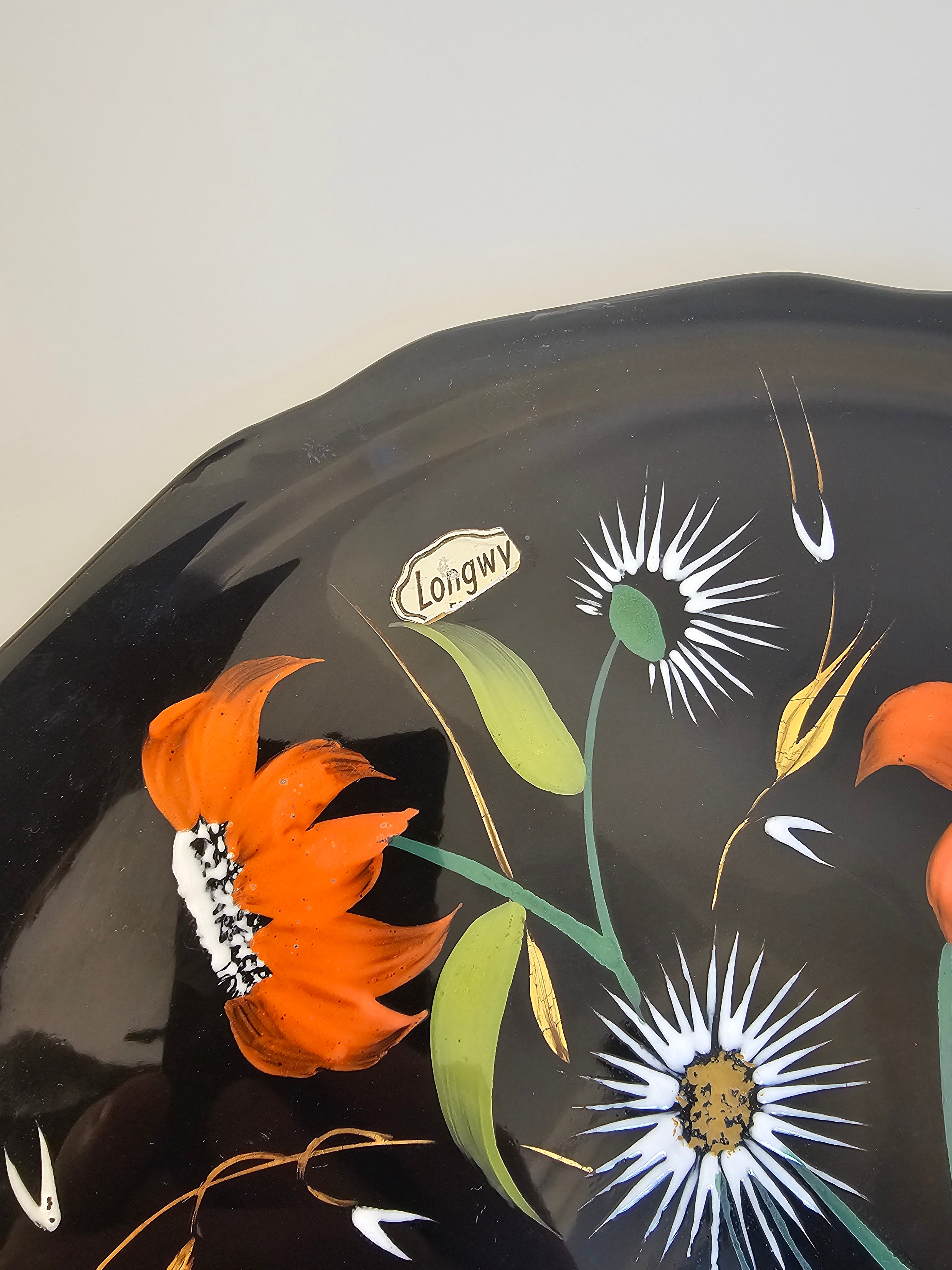 Plat en porcelaine désigné Valenti pour Longwy noir et à motifs fleuris