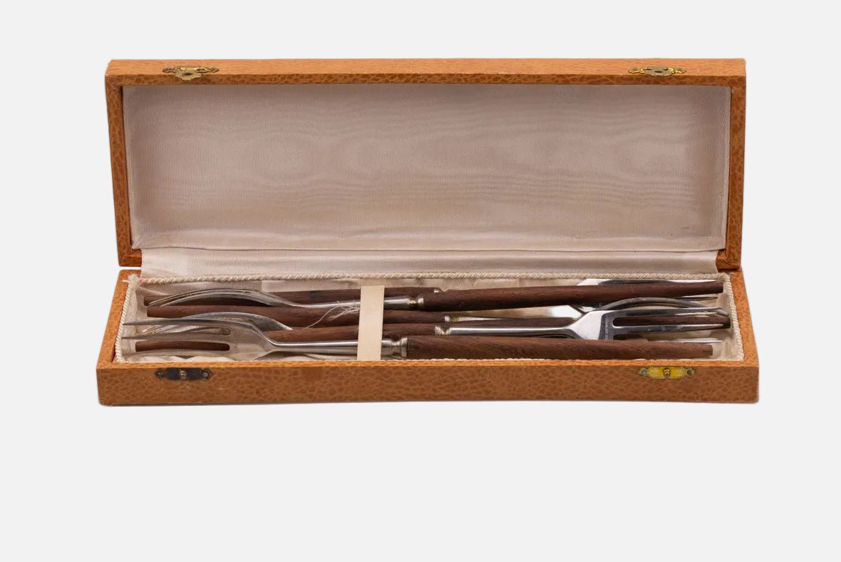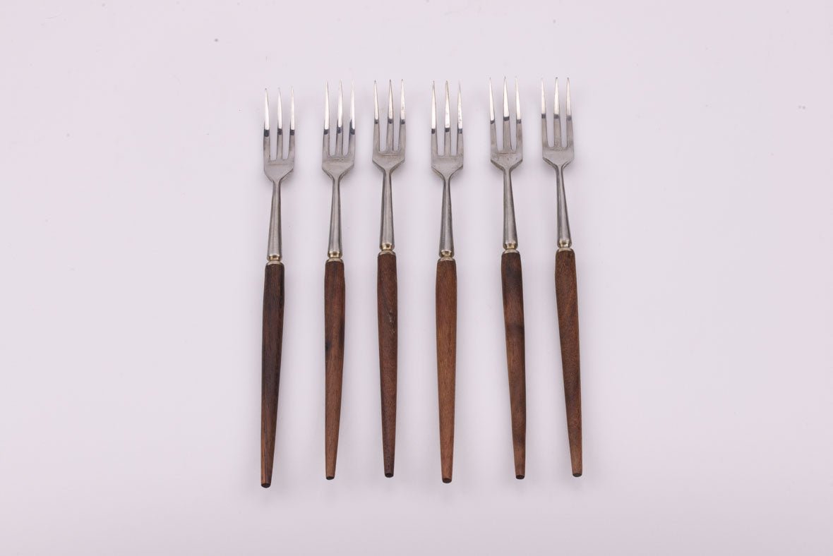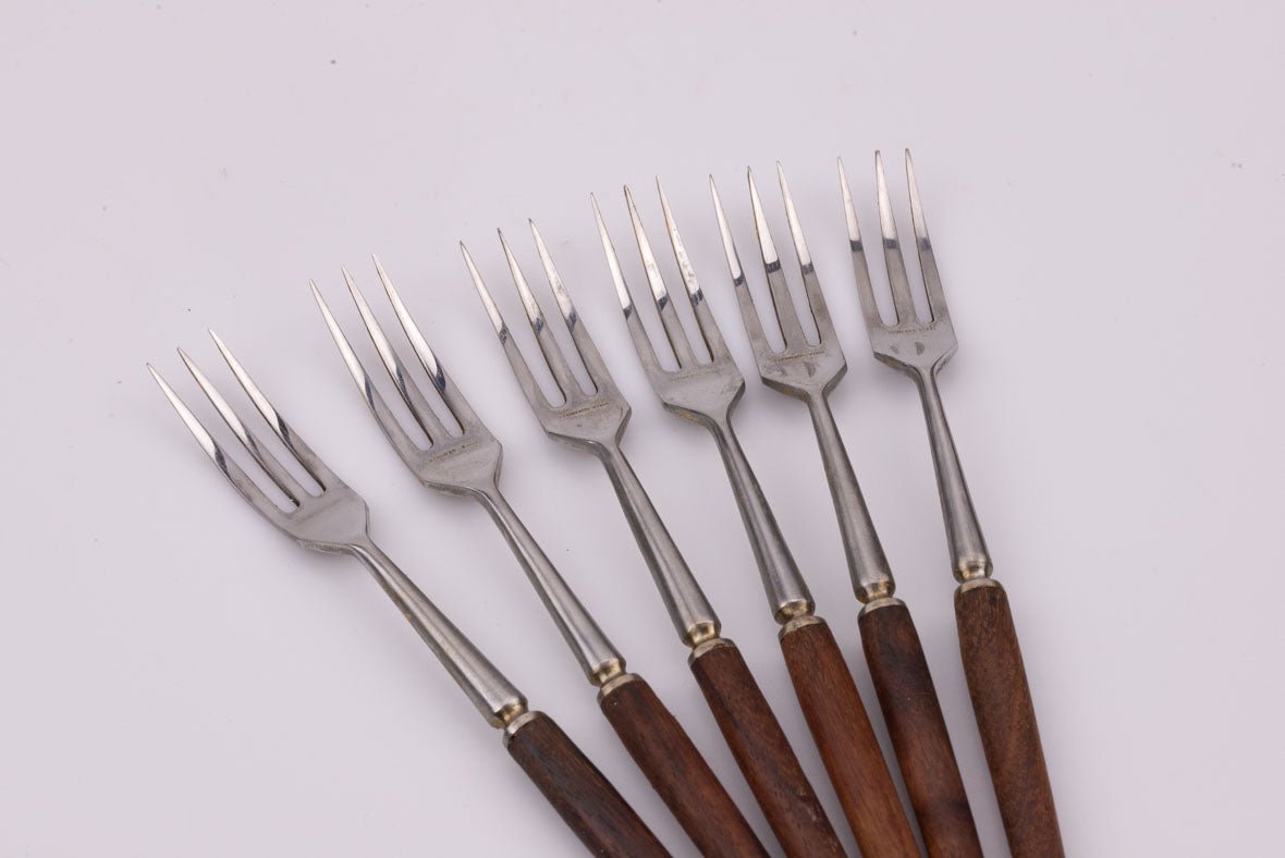 Een prachtige set van 6 grote (26 cm) roestvrijstalen vorken met houten handvatten. De set wordt geleverd in de originele... Lees meer
