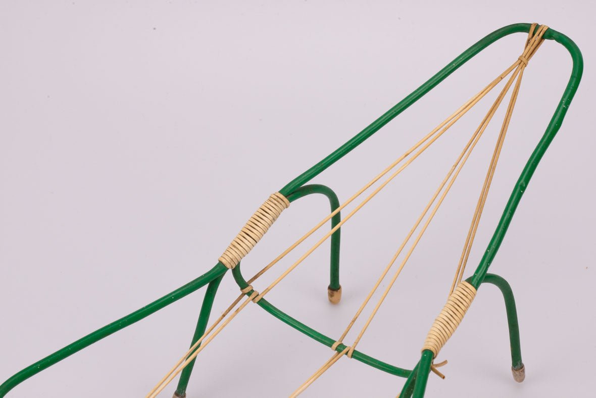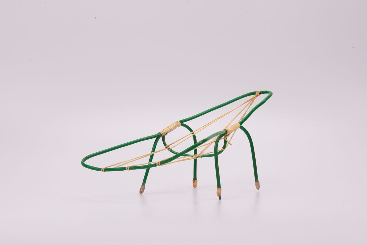 Originele fruitschaal van groen metaal, gevlochten met gele Scoubidou-koorden en beige antislipvoetjes (waarvan er één licht beschadigd is). Dit item... Lees meer
