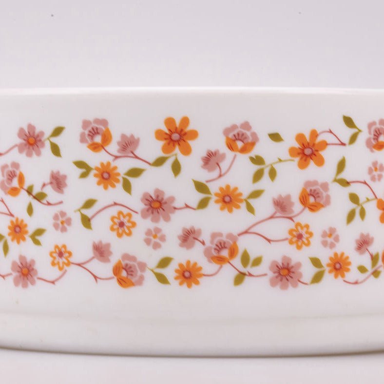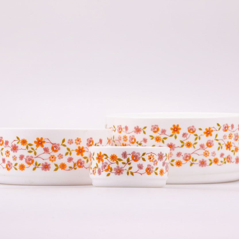 Trio Arcopal Scania saladeschalen van wit opaalglas met oranje bloemen
